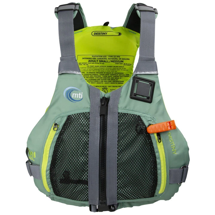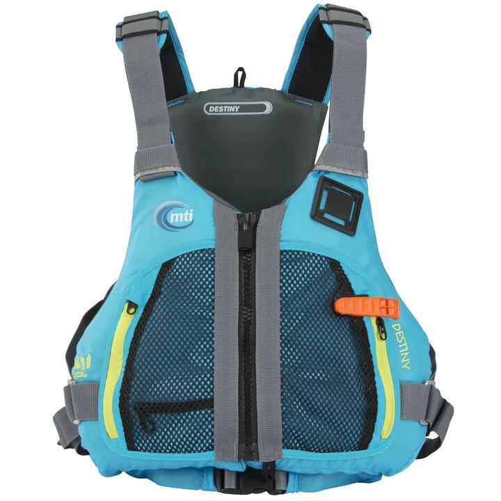 The MTI® Women’s Destiny PFD’s sculpted racerback, contoured chest panels, and Adjust-A-Bust fit system allow for freedom of movement and all-day comfort. Bring your gear on the go with two zippered mesh pockets, two easy-access pockets, and a key clip!