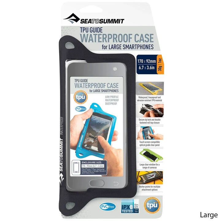 Sea to Summit’s® TPU Guide Waterproof Phone Cases are a slim, yet robust, solution for protecting and using your phone in any conditions. RF welded Thermoplastic Polyurethane (TPU) and the zip lock, triple-roll hook-and-loop fastener keep this soft case both watertight and slim. The TPU is PVC free, strong, flexible, durable, UV and extreme cold resistant. Die-cut attachment points round out this tough little package.