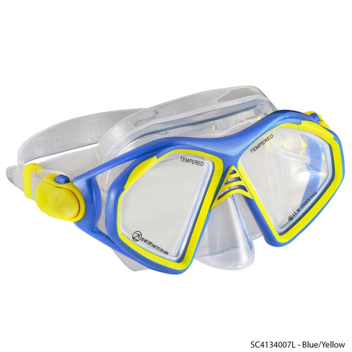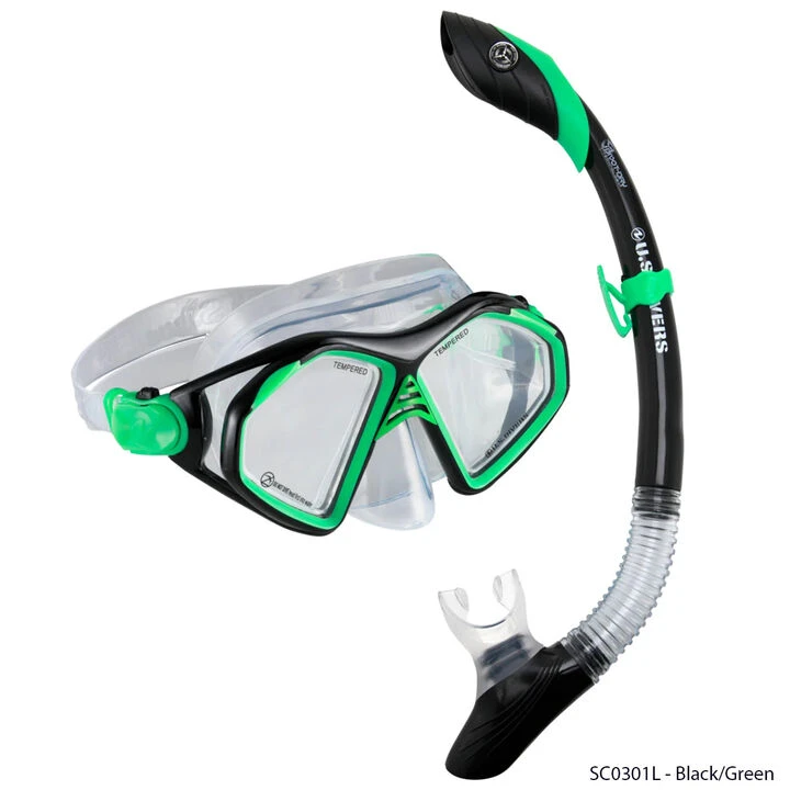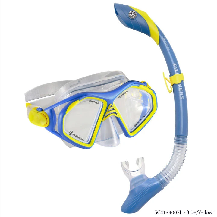 The U.S. Divers® Admiral Mask and Snorkel Combo makes your beach visits memorable! The Admiral Snorkeling Mask features a soft, Silicone face skirt that provides a comfortable seal against water leaks. The Island Dry Snorkel has Dry-Top technology that seals the snorkel for quick subsurface dives for closer exploration.