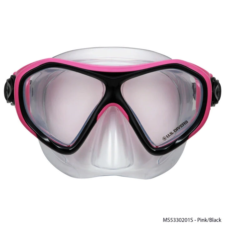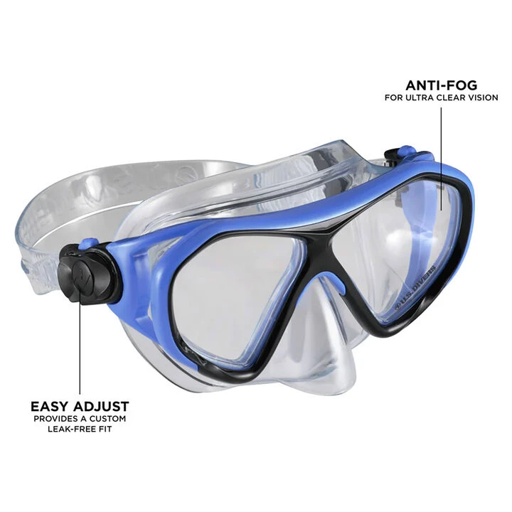 The U.S. Divers® Dorado Jr. DX Snorkeling Mask for kids is designed for optimal performance with eye-catching colors! It has a polycarbonate dual-window design with anti-fog lenses for crystal-clear vision. Adjustable 3-way buckles help secure the fit, both side to side and up and down, with room to adjust as a child grows. Its split strap and adjustable buckles guarantee a secure and leak-free fit for hours of underwater exploration. The Dorado Jr. DX Snorkel Mask gives kids an unforgettable aquatic experience!